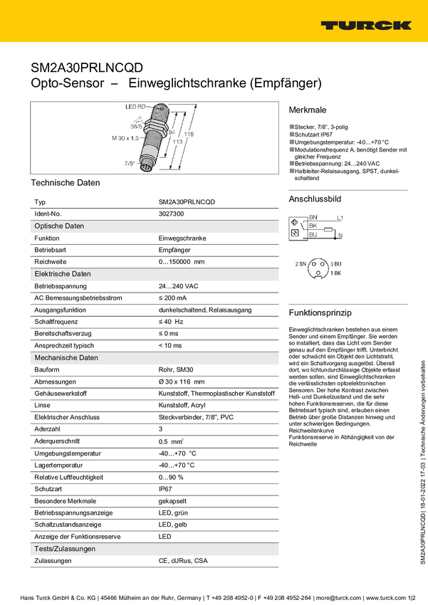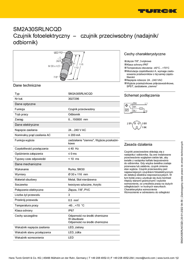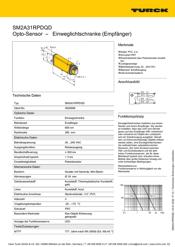 Czujnik światłowodowy Turck SM2A312FPQD 3026844, 1 szt.
