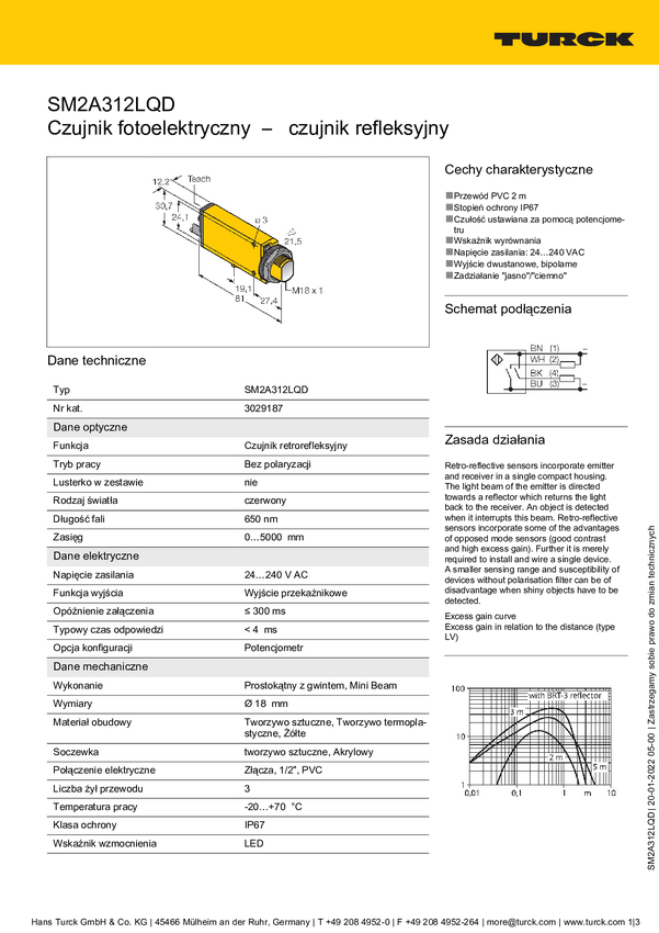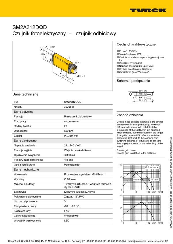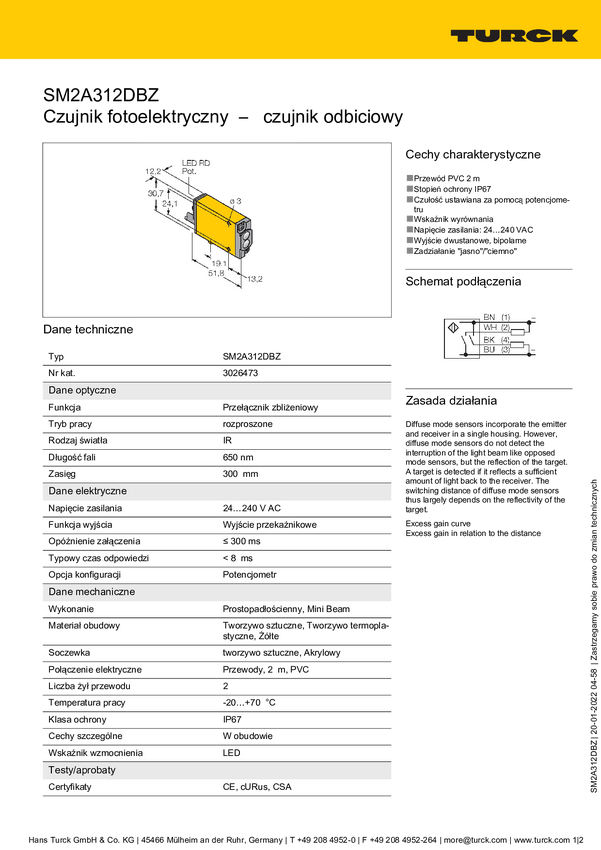 Czujnik dyfuzyjny Turck SM2A312W 3026265 1 szt.