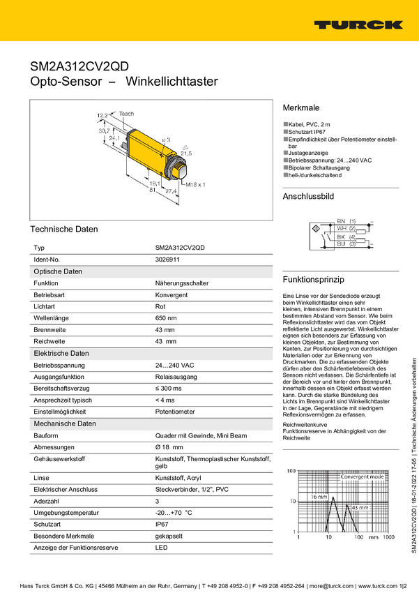 Czujnik światłowodowy Turck SM2A312FPQD 3026844, 1 szt.