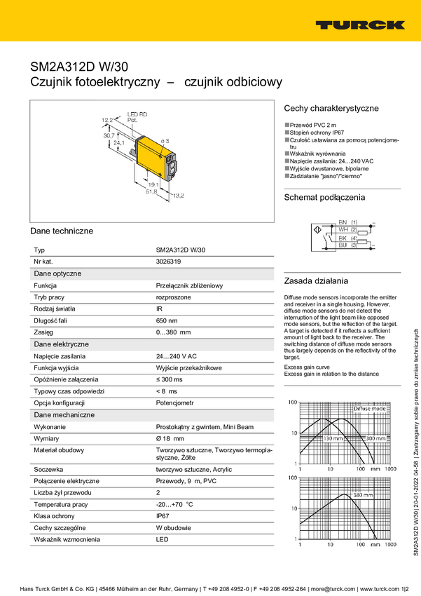 Czujnik dyfuzyjny Turck SM2A312D W/30 3026319 1 szt.