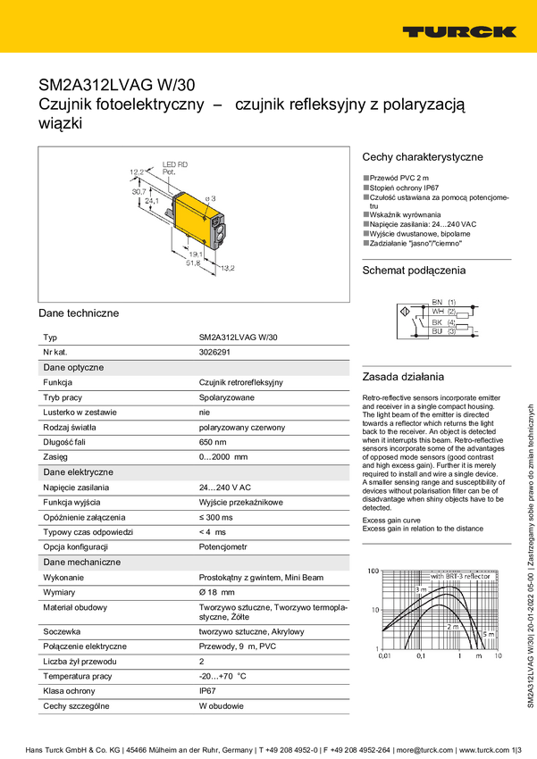 Fotokomórka odbiciowa Turck SM2A312LV W/30 3026376 1 szt.