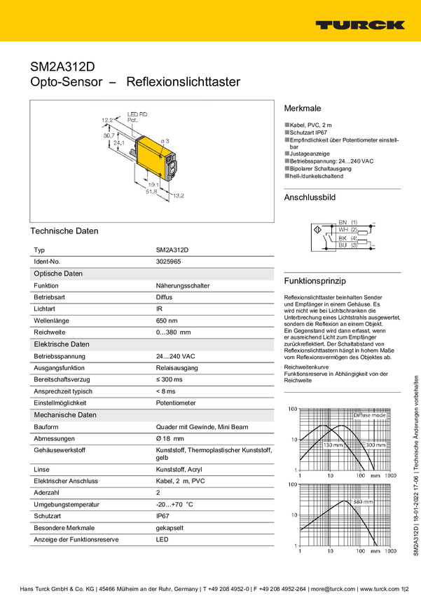 Czujnik dyfuzyjny Turck SM2A312D 3025965 1 szt.