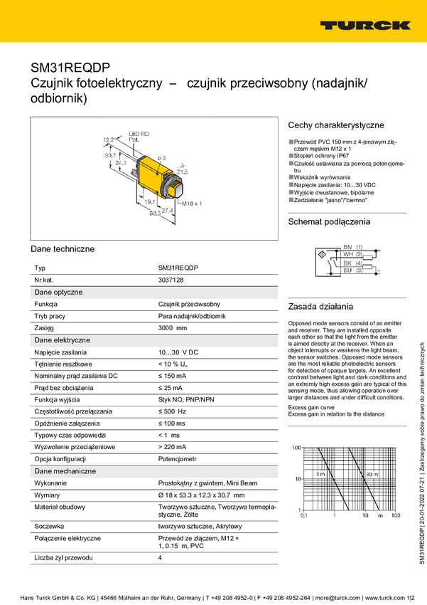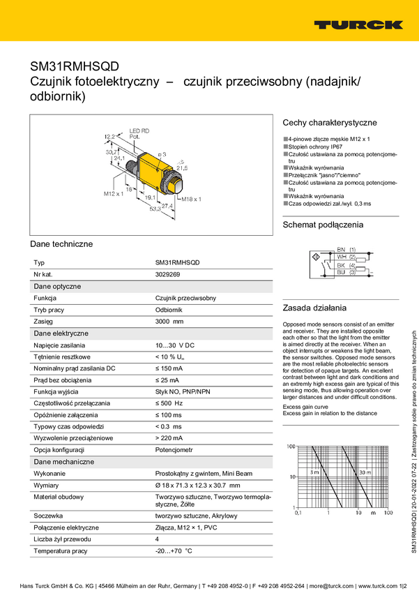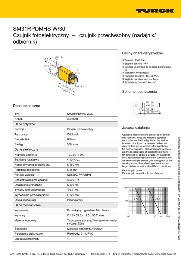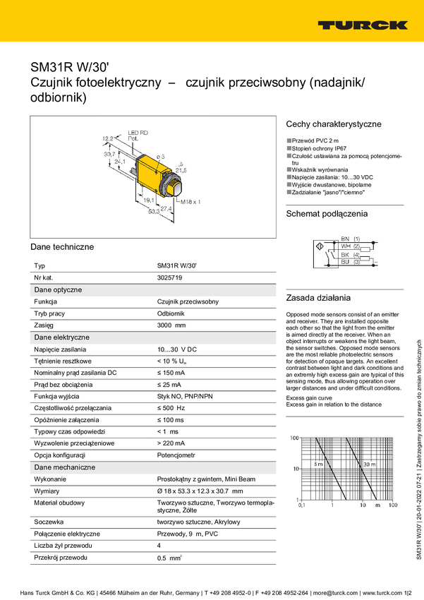 Bezzwrotny czujnik fotoelektryczny Turck SM31R W/30' 3025719 1 szt.