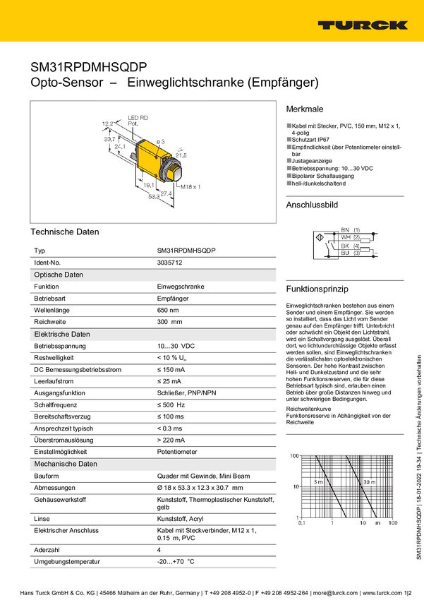 Bezzwrotny czujnik fotoelektryczny Turck SM31RPDMHS W/30 3035658 1 szt.