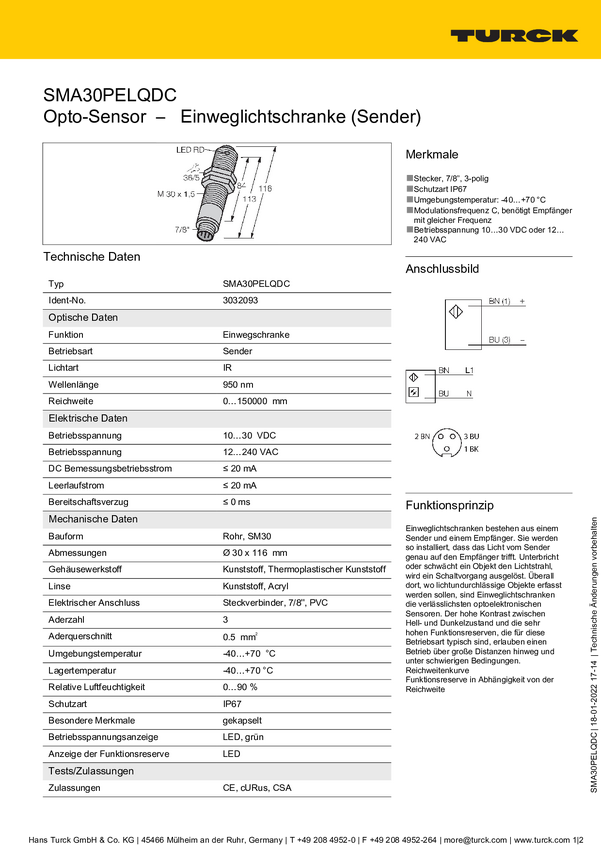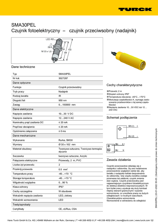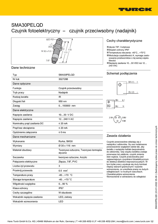 Bezzwrotny czujnik fotoelektryczny Turck SMA30PEL 3027287 1 szt.