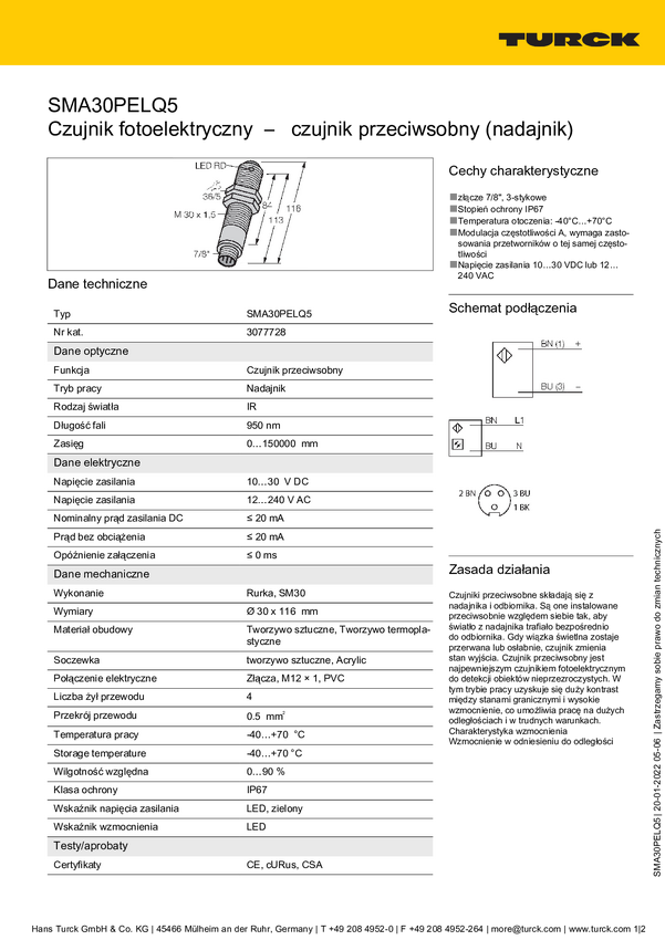 Bezzwrotny czujnik fotoelektryczny Turck SMA30PELQ5 3077728 1 szt.
