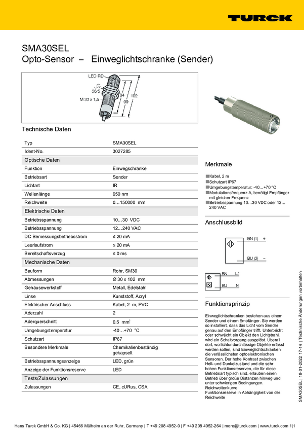 Bezzwrotny czujnik fotoelektryczny Turck SMA30SEL 3027285 1 szt.