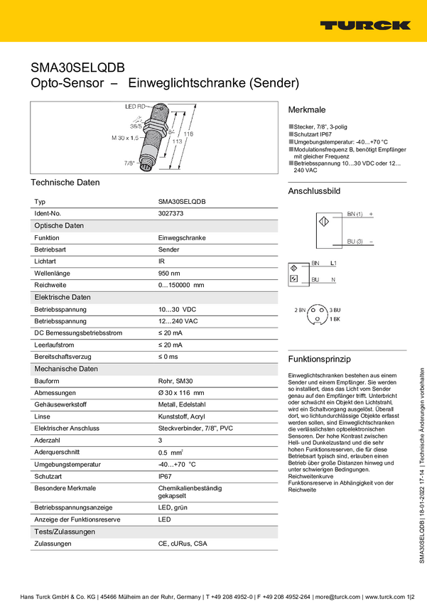 Bezzwrotny czujnik fotoelektryczny Turck SMA30PELQD 3027288 1 szt.