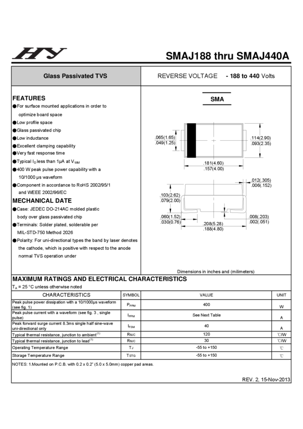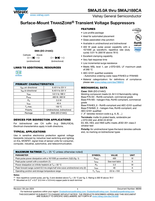 Diode TVS Single Uni-Dir 180V 400W 2-Pin SMAJ Embossed T/R