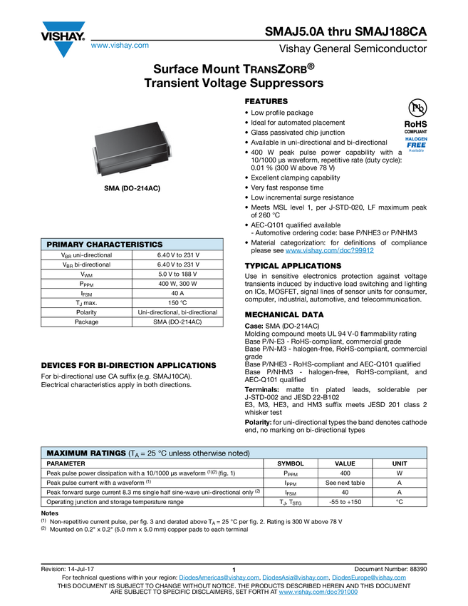 Dioda; transil; TVS; 300W; 12V; 20,1A; dwukierunkowa; DO214AC (SMA); SMAJ12CA; VISHAY; RoHS; opakowanie/100szt