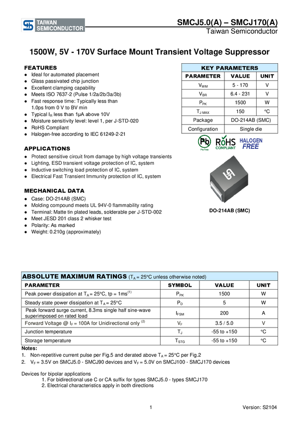 Diode TVS Single Uni-Dir 8.5V 1.5KW 2-Pin DO-214AB