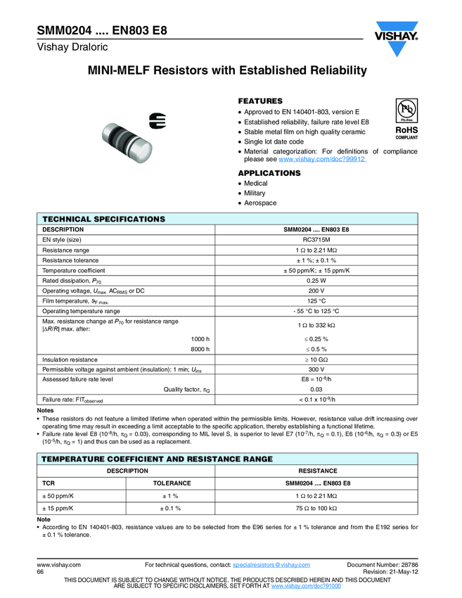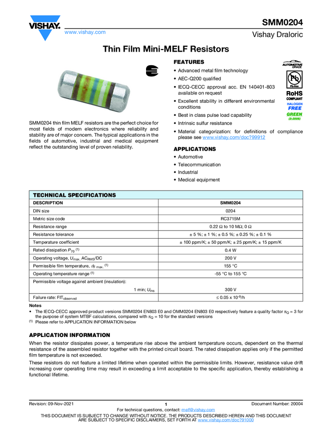 Res Thin Film 0204(1406) 274 Ohm 1% 1/4W ±50ppm/°C Conformal Melf SMD Blister T/R