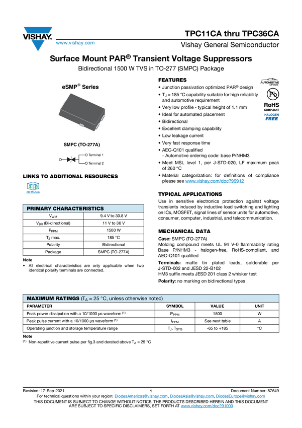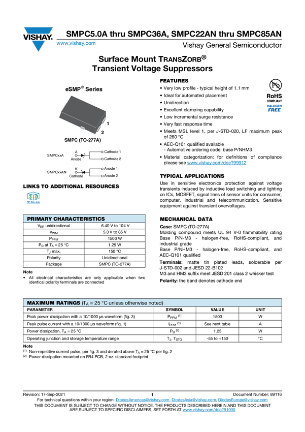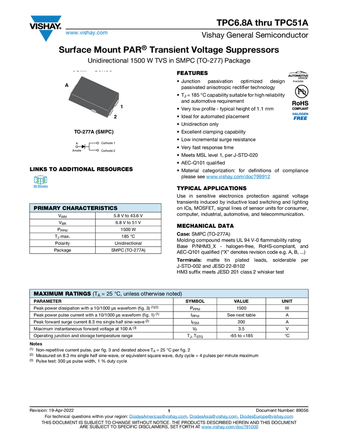 Surface-Mount PAR® Transient Voltage Suppressors Unidirectional 1500 W TVS in SMPC (TO-277) Package