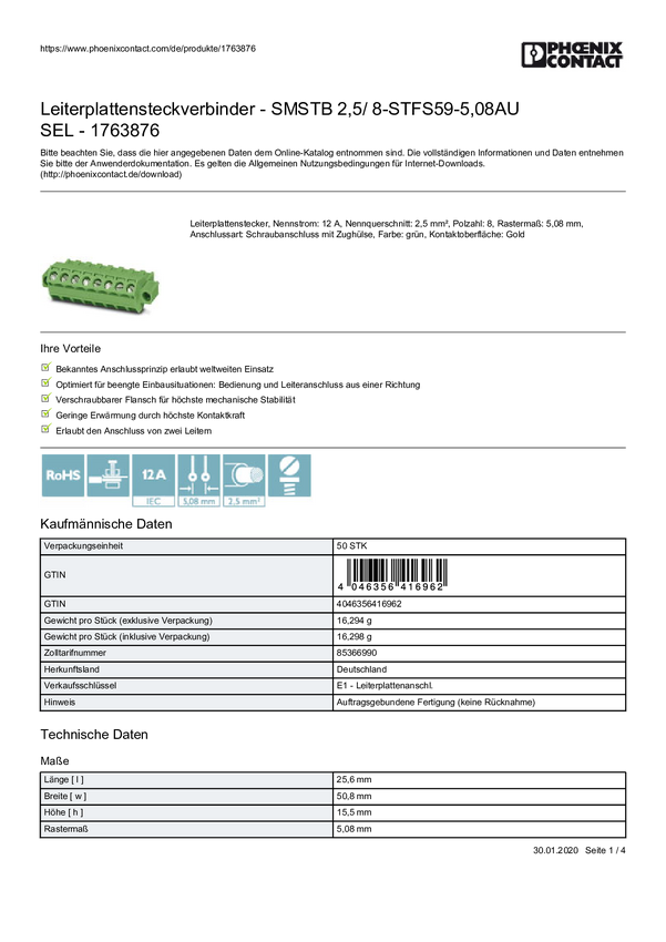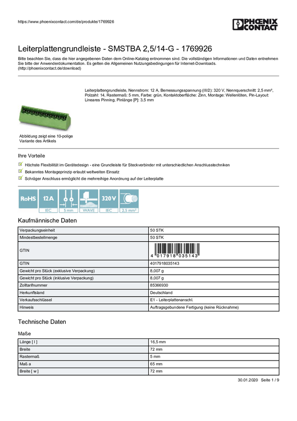 Phoenix Contact 1769926 Obudowa złącza pin męskiego na PCB SMSTBA 2,5/14-G, piny: 14, 12 A, 1 szt.