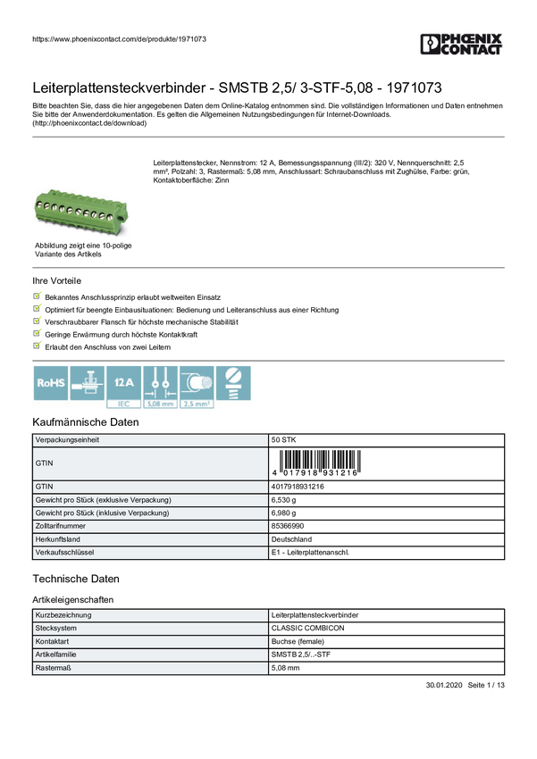 Phoenix Contact 1971073 Obudowa złącza pin żeńskiego na kabel SMSTB 2,5/ 3-STF-5,08, piny: 3, 12 A, 50 szt.