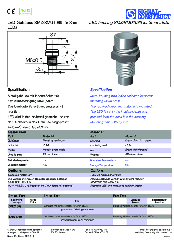Oprawka LED, SMU1069, pasuje do LED 3 mm, M6 x 0,75, czarna / odbłyśnik wewnętrzny