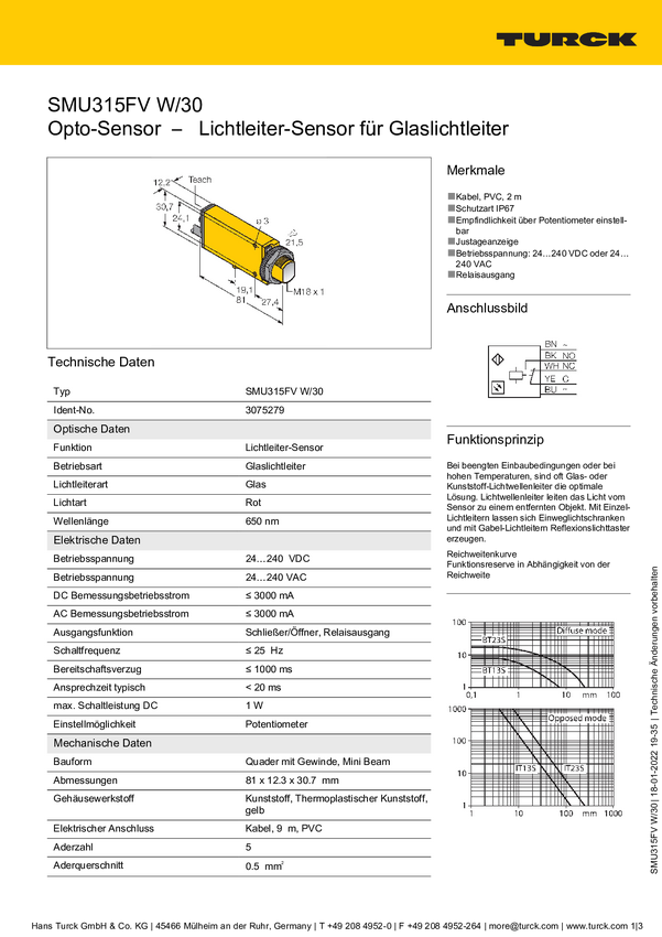 Czujnik światłowodowy Turck SMU315FV W/30 3075279, 1 szt.