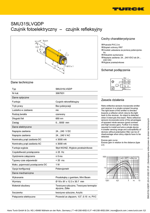 Fotokomórka odbiciowa Turck SMU315LV W/30' 3062424 1 szt.