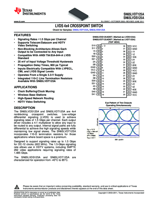 Digital Crosspoint Single 4x4 1.5Gbps 38-Pin TSSOP T/R