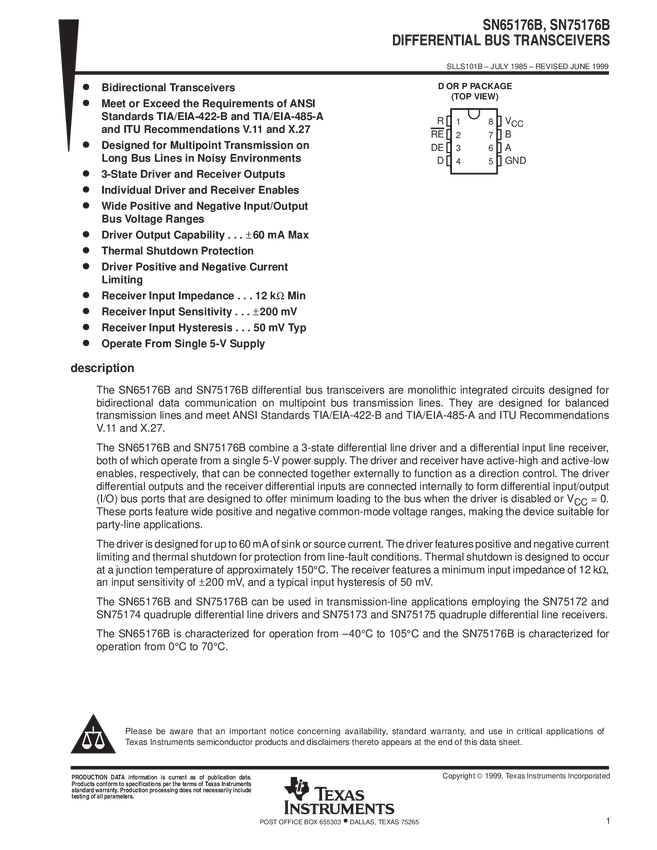 Układ scalony; SN75176BP; IC; interfejs; bus transceiver; RS422, RS485, half duplex; 10Mbps; 70mA; DIP8; THT; = DS75176; TEXAS INSTRUMENTS; RoHS