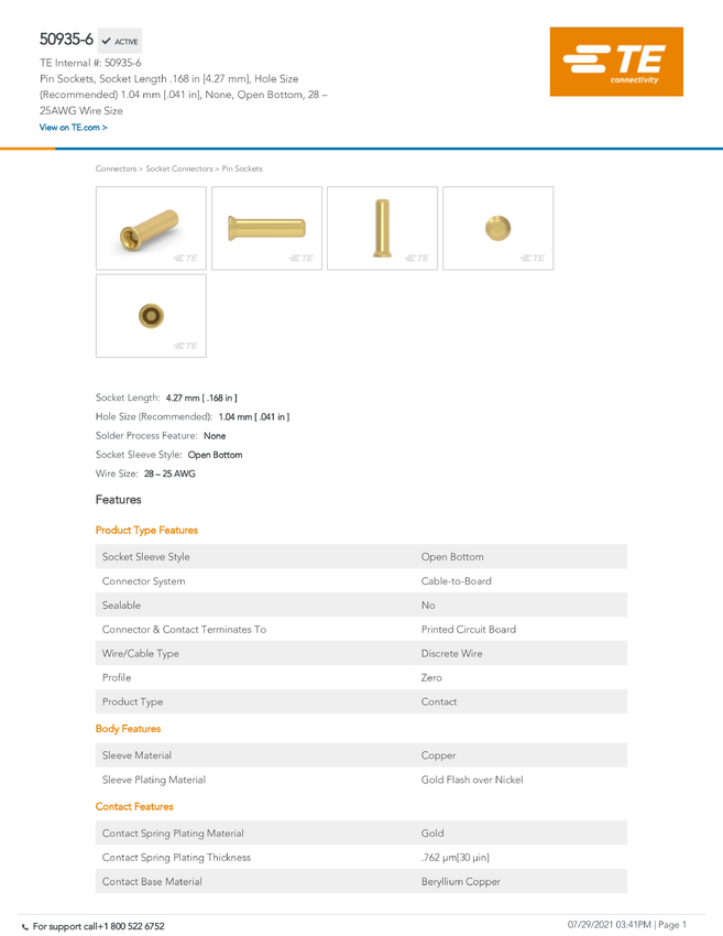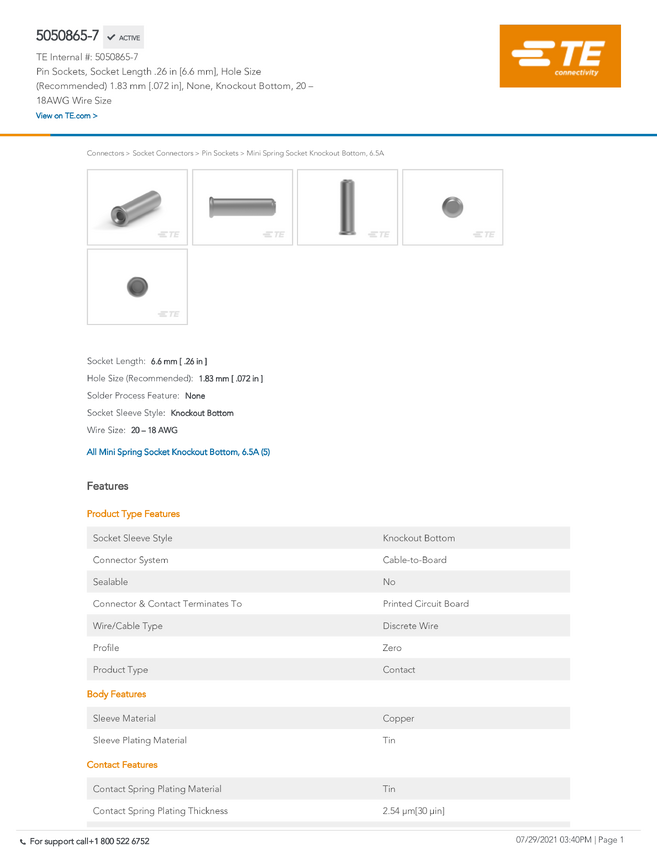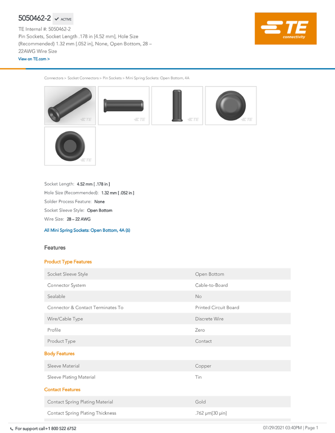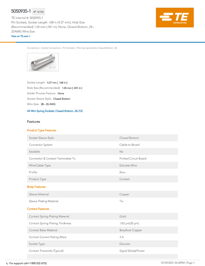 TE Connectivity 50935-6 TE AMP Mini-Spring Sockets, 1 szt.