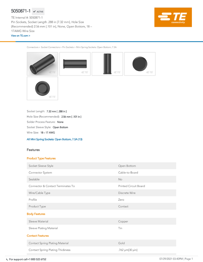 TE Connectivity 5050871-1 TE AMP Mini-Spring Sockets, 1 szt.