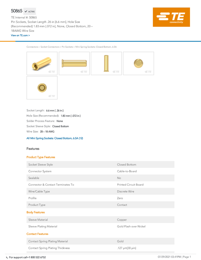 TE Connectivity 50865-2 TE AMP Mini-Spring Sockets, 1 szt.