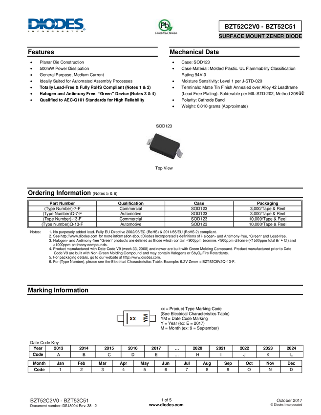 Dioda; BZT52C5V1-7-F; Zenera; 5,1V; 0,37W; SOD123; SMD; DC COMPONENTS; RoHS; opakowanie/100szt