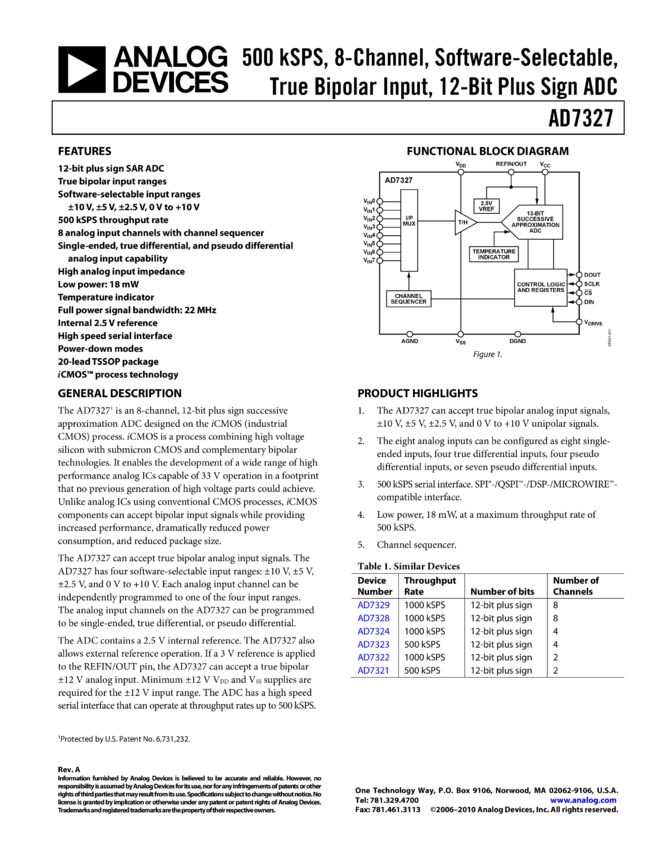 AD7327: 500 kSPS, 8-Channel, Software Selectable True bipolar Input, 12-Bit Plus Sign A/D Converter