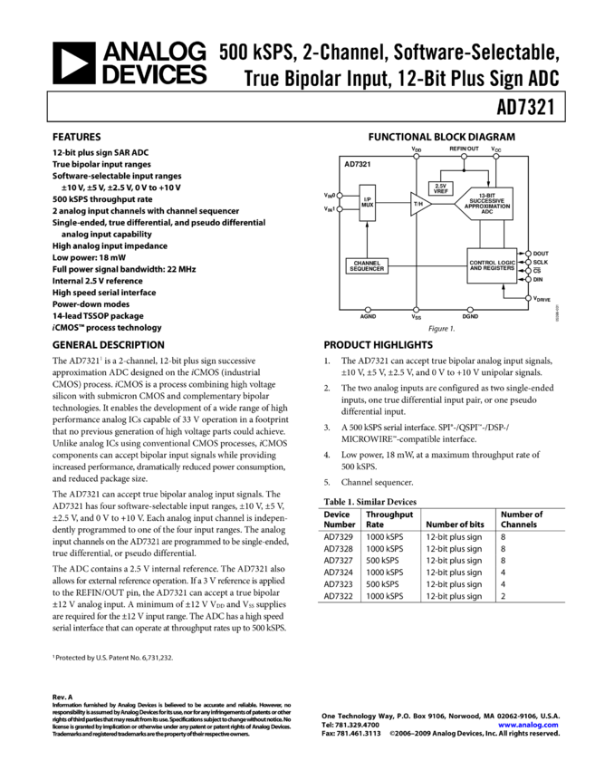 AD7321: 500 kSPS, 2-Channel, Software-Selectable, True Bipolar Input, 12-Bit Plus Sign ADC