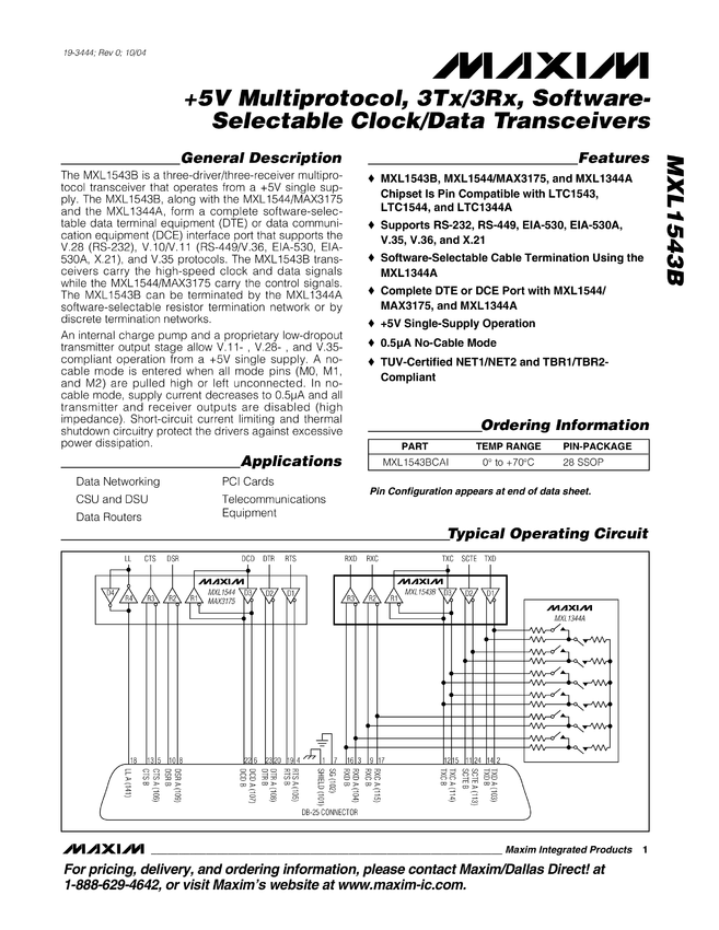 MXL1543B +5V Multiprotocol, 3Tx/3Rx, Software-Selectable Clock/Data Transceivers