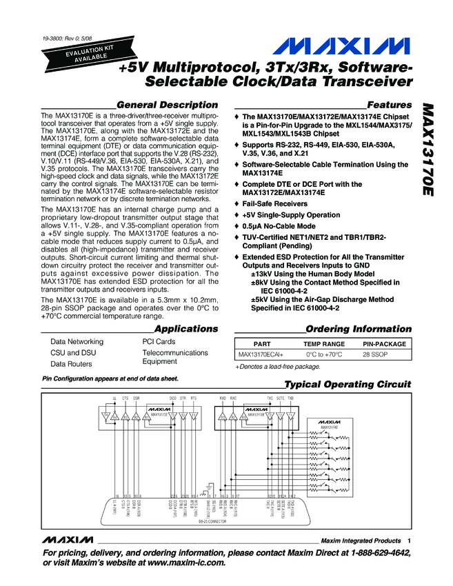 MAX13170E +5V Multiprotocol, 3Tx/3Rx, Software-Selectable Clock Transceivers
