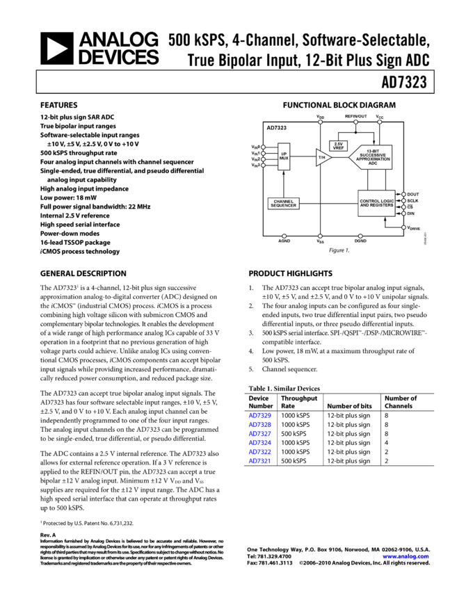 AD7323: 500 kSPS, 4-Channel, Software Selectable True bipolar Input, 12-Bit Plus Sign A/D Converter