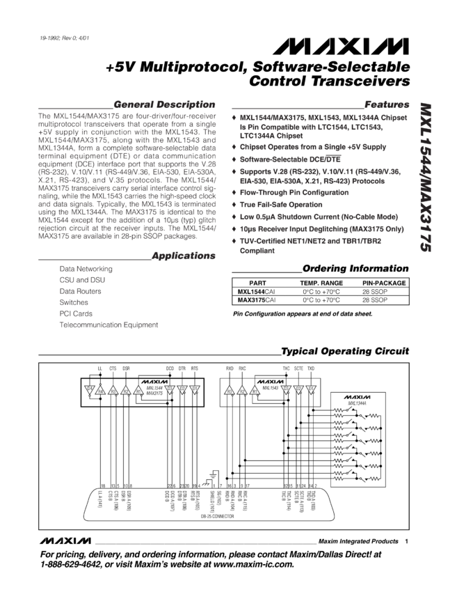 MAX3175, MXL1544 +5V, Multiprotocol, Software-Selectable Control Transceivers