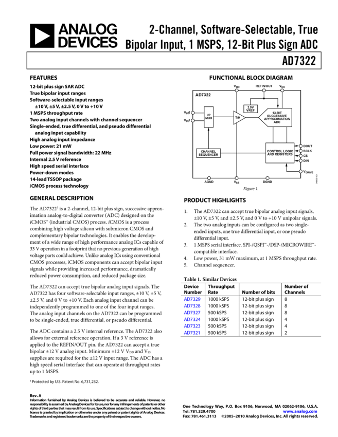 AD7322: Software Selectable True Bipolar Input, 2-Channel, 12-Bit Plus Sign ADC