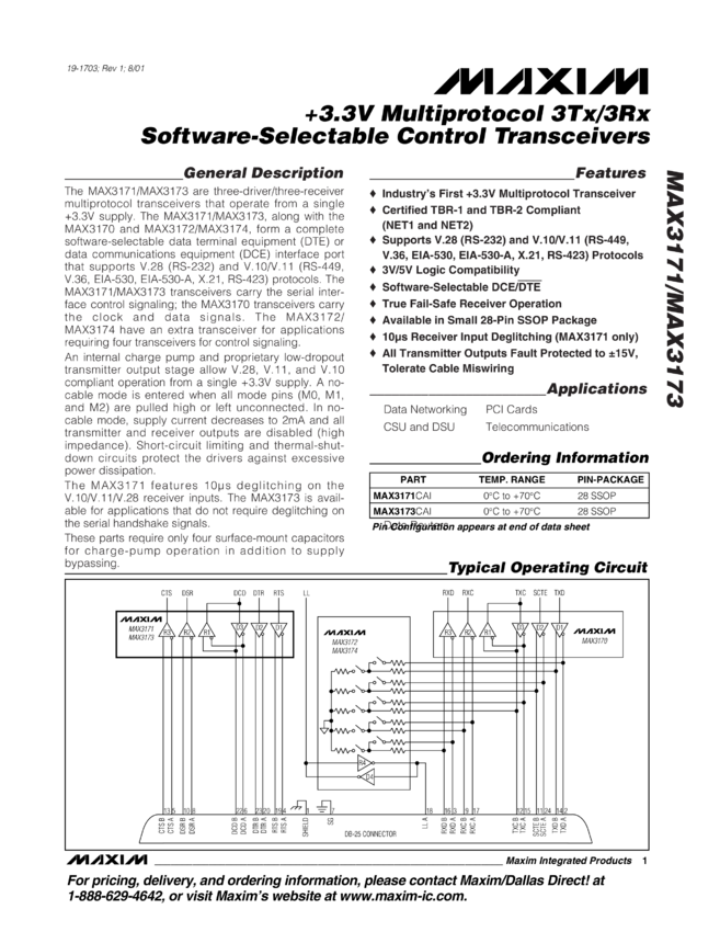 MAX3171, MAX3173 +3.3V Multiprotocol 3Tx/3Rx Software-Selectable Control Transceivers