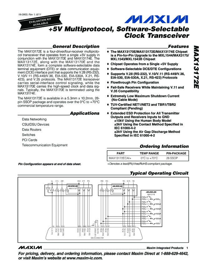 MAX13172E +5V Multiprotocol, Software-Selectable Clock Transceiver