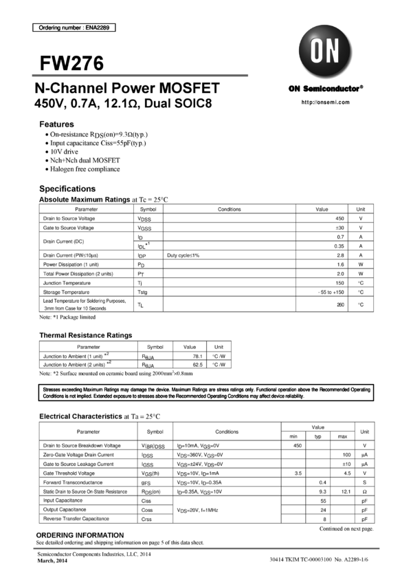N-Channel Power MOSFET, 450V, 0.7A, 12.1Ω, Dual SOIC8