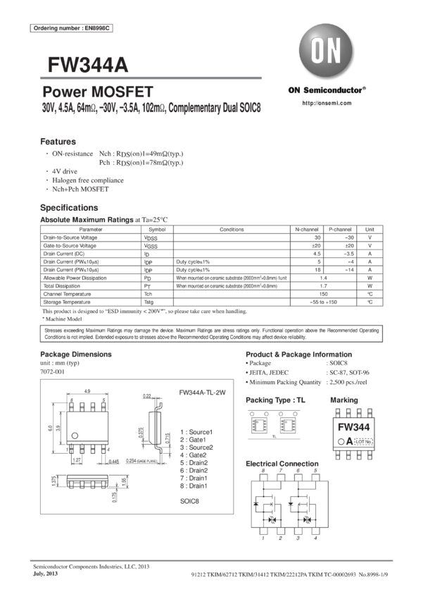 Power MOSFET, 30V, 4.5A, 64mOhm, -30V, -3.5A, 102mOhm, Complementary Dual SOIC8