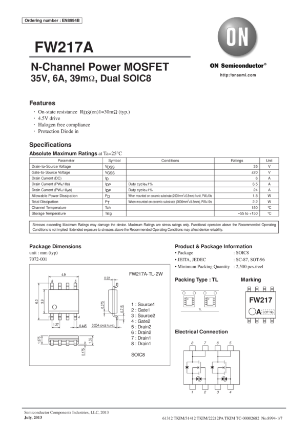 N-Channel Power MOSFET, 35V, 6A, 39mOhm, Dual SOIC8