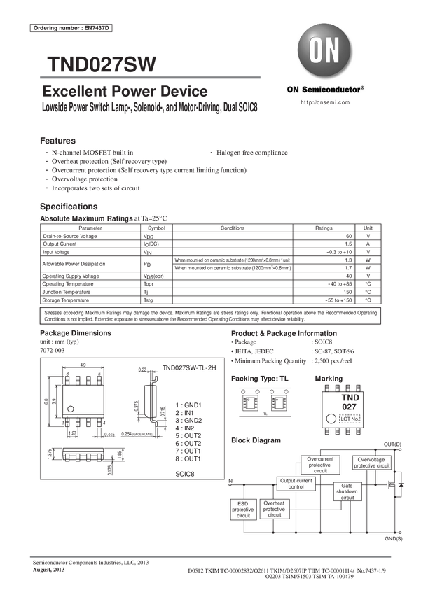 Low Side Power Switch Lamp-, Solenoid-, and Motor-Driving, Dual SOIC8