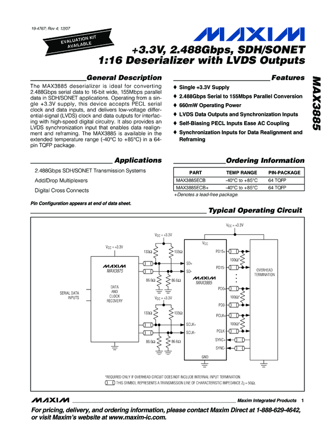 MAX3885 +3.3V, 2.488Gbps, SDH/SONET 1:16 Deserializer with LVDS Outputs