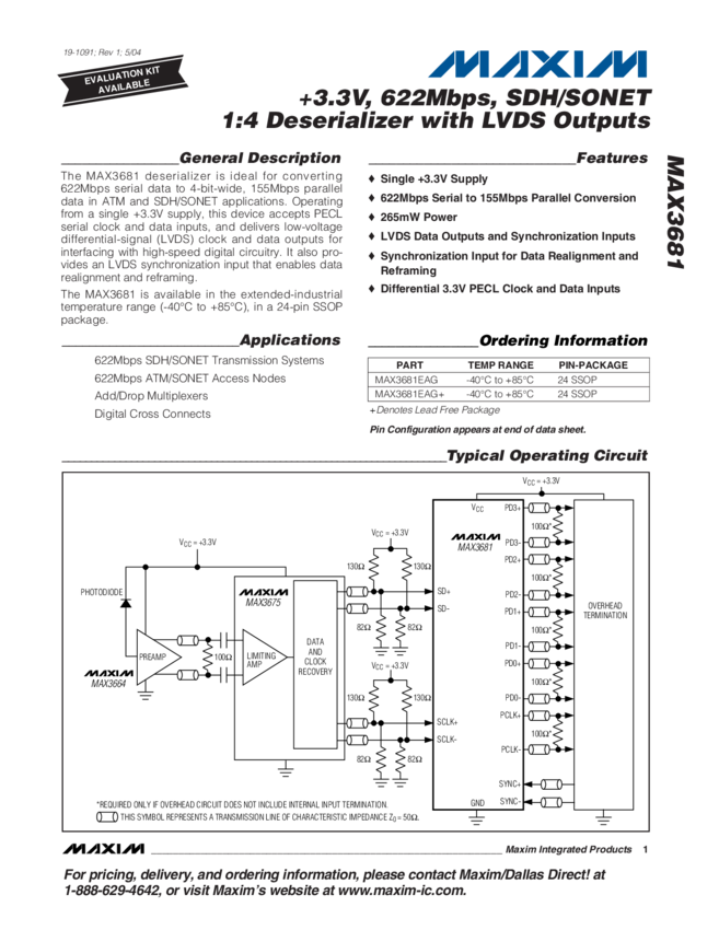 MAX3681 +3.3V, 622Mbps, SDH/SONET 1:4 Deserializer with LVDS Outputs
