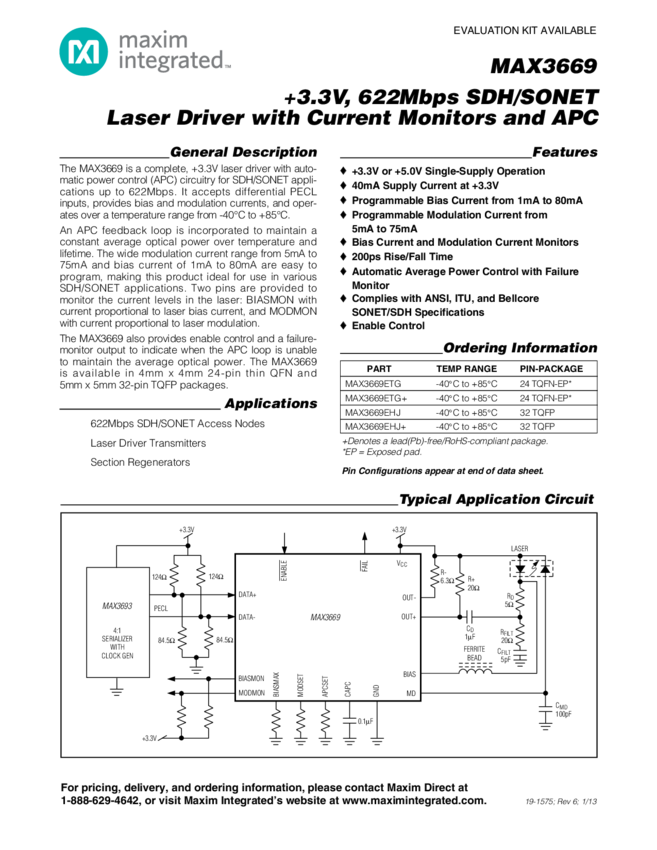 MAX3669 +3.3V, 622Mbps SDH/SONET Laser Driver with Current Monitors and APC