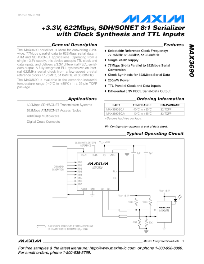 MAX3690 +3.3V, 622Mbps, SDH/SONET 8:1 Serializer with Clock Synthesis and TTL Inputs
