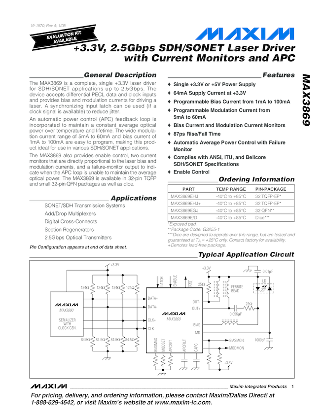 MAX3869 +3.3V, 2.5Gbps SDH/SONET Laser Driver with APC and Current Monitors