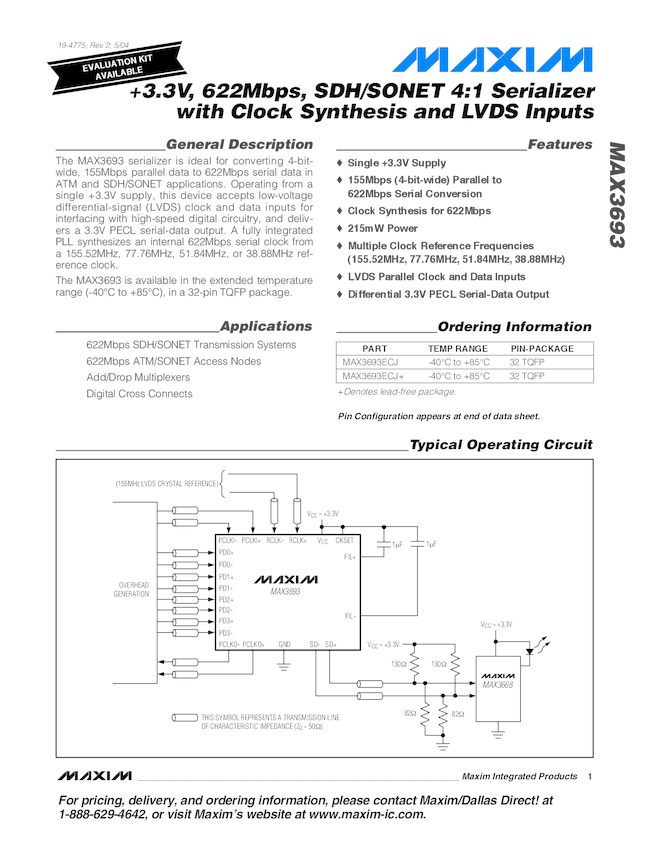 MAX3693 +3.3V, 622Mbps, SDH/SONET 4:1 Serializer with Clock Synthesis and LVDS Inputs
