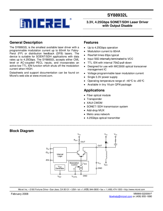 SY88932L - 3.3V, 4.25Gbps SONET/SDH Laser Driver with Output Disable