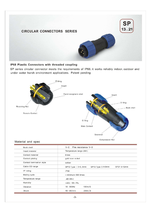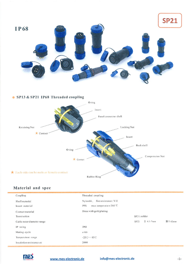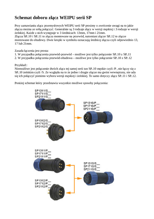 Złącze kompletne hermetyczne; 30A; 500V; wtyk SP2110; 2 tory; 7-12mm; na przewód; gniazdo SP2112; 2 tory; na panel; 21mm; typu Weipu; IP68; RoHS