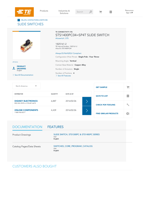 Switch Slide SP4T Top Slide 0.25A 125VAC 10000Cycle PC Pins Thru-Hole Bulk